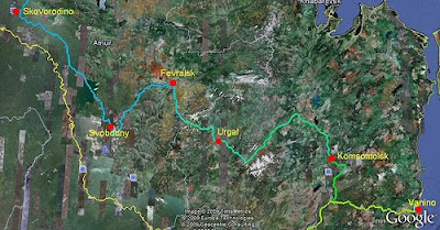 | Так мы про восточную часть и говорим. Они собирались идти до Февральска так как дальше тупик на Зее, Им пришлось сесть в поезд в Исе, так как в XTихе была эмульсия и она не могла дальше ехать. В Исе ничего кроме нигрола не нашли. Проехали они на поезде только от Исы до Февральска, а это всего 90км. Дорога там лучше чем до Исы. Т.е. от Комсомольска до Исы они прошли. трек: