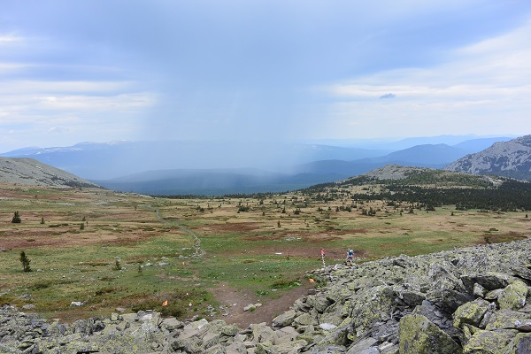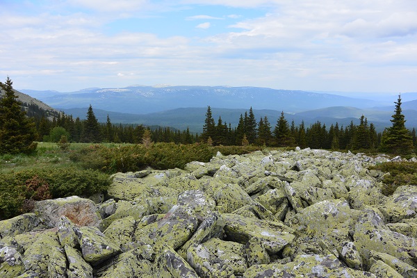 | Мы снова рано встали. Положа руку на сердце, нам это уже нравится: идёшь или едешь куда заблагорассудится, никто под ногами особо не путается, ещё и времени уйма остаётся. К тому же пара незабвенных вечеров в Уфе окончательно убедила нас, что человеку совершенно не обязательно высыпаться, чтобы утром чувствовать себя счастливым. В общем, мы поднялись в 5.45 и спустя час уже покинули турбазовский двор, направив свои стопы к вершине горы Иремель. Дорога пошла на подъём уже метров через 20, поэтому можно со всей ответственностью заявить, что следующие 12 километров мы шли в гору, что заняло у нас чуть больше 3,5 часов. Высота Большой Иремели 1582 метра, так что сами понимаете, подниматься пришлось долго, ибо постепенно. Первые 6 километров мы бодро отмахали по дороге, где после полудня начали сновать УАЗики, подвозя ленивых туристов к "сторожевому посту" у начала сугубо пешеходной тропы к вершине. Там, как выяснилось, ещё и проходит граница с Башкирией, так что гора принадлежит всё-таки не Челябинской области. После первых начались вторые 6 километров, там приходилось чаще шагать по большущим камням и обнажившимся корням и непрерывно подниматься, подниматься, подниматься. На некоторых деревьях развешаны указательные тряпочки или краской нанесён трёхцветный знак - это чтобы не сбиться с тропы, особенно зимой, когда её не видно. Мы добросовестно карабкались, лавировали, переходили по каменюкам местную речку несколько раз, резвились, пока сил хватало, что уж скрывать :Р Было жарче, чем мы предполагали, мы умывались в речке, отбивались от комаров, пыхтели, но пёрли и пёрли вперёд. Точнее, вверх. И вдруг!.. жара исчезла. Деревья расступились, и мы увидели снег. Очень, кстати, вовремя. Мы им умылись, накидали чуток себе за шиворот и умиротворённые двинули дальше. А дальше были испятнанные лишайником камни. Их было много, и они весьма живописно тянулись перемешанной массой вдоль тропы, словно ещё одна река. Необыкновенная картина. Но на финишной прямой нас ждал последний километр, и в нём содержалось таких камней намного больше. К тому же по ним нужно было взобраться вверх. Только по ним. Никаких поблажек в виде лестниц или перил не предусматривается: хочешь -изволь напрячься. Верх воооон там, смотреть шапка сваливается. Однако надо признать, что скользкими камни не были. Шатались некоторые - это да, но никто ж и не обещал, что будет легко. Словом, гору мы покорили. На свой страх и риск. Наверху непрерывно дул свежайший чудесный ветер, рос можжевельник и цвели одинаковые белые цветочки. Стало холодно, мы попрятались в куртки и сели обедать. Часы показывали 11 с чем-то. И теперь нас ждал столь же длительный спуск, более мучительный, чем подъём. Кто догадается почему? Спуск по каменной россыпи - самая приятная часть этого отрезка (начало третьих шести километров, кстати). А дело вот в чём: при каждом шаге нога упирается в носок обуви, и каждый шаг - это приземление с немного бОльшей силой, чем ты сам хочешь. Прибавьте к этому шум в ушах (давление до вершины меняется на 100мм рт.ст., если верить стенду у входа) и начинающийся дождь.. Нам несказанно повезло: мы успели проскакать вниз до того, как он начался, а потом навстречу нам стали попадаться турысты; я сильно сомневаюсь, что они смогли забраться на самый верх по мокрым камням... О, последние наши распоследние шесть километро
