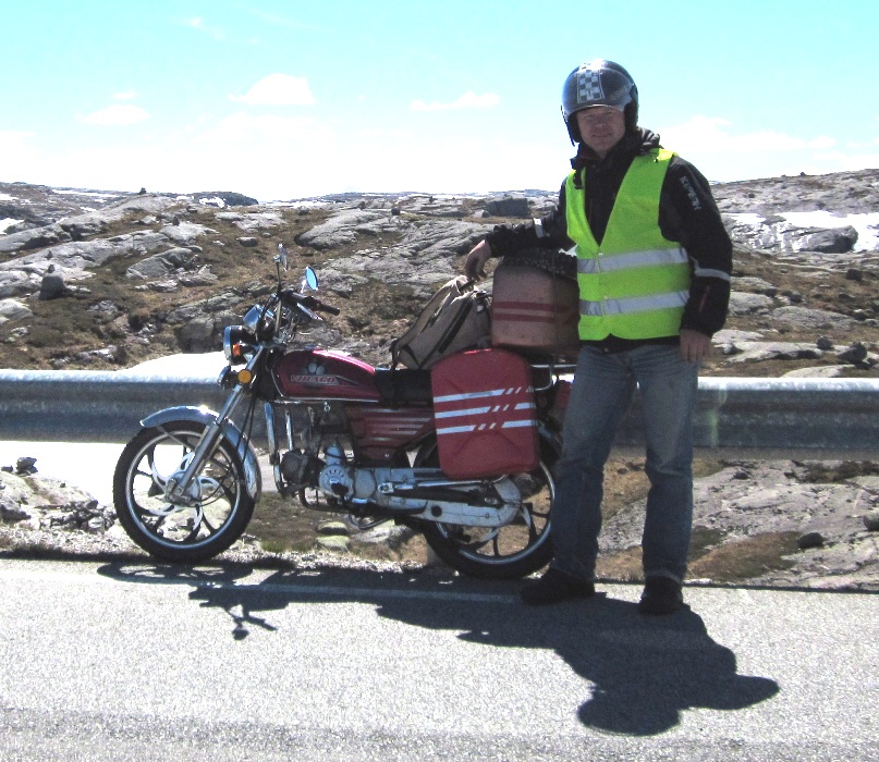 Каждый из людей, листая глянец с видами экзотических стран, пытается примерить к себе очередную фотографию с классическим рекламным видом. Будь то пальмовый пляж с коралловым песком и небесным морем, или брутальная хижина с видом на суровую северную природу. Однако если применить к данным пейзажам трезвый взгляд, железную логику и шишковатый жизненный опыт, то оказывается, что на острове стоит невыносимая жара и отупляющая скука, в хижине воняет, а суровая северная природа настолько сурова, что даёт полюбоваться собой на более 10 минут. Но глянцевый камень уже брошен и на поверхности сознания расходятся круги «розовых снов». В Норвегию хотелось съездить давно, это было своего рода мечта из области «розовых снов» типичного российского мужика. Понятно, что всё для её исполнения имеется, но для этого надо оторвать спину от дивана, отставить пивную бутыль в сторону, и вообще встряхнуться. Итак, отлепляем спину от лучшего друга всех мужчин и приклеиваем задницу к стулу напротив компьютерно-интернетного «окна в мир» для сбора информации о предстоящем путешествии. Иногда процедура подготовки к нему не менее увлекательна, чем само путешествие, поэтому дабы не затягивать до бесконечности этот этап я проанализировал всё имеющеюся на данный момент времени. А имелось не так уж и много. 1. Собственно транспортное средство (мопед Альфа Вираго на 110 куб). Появился он у меня, закоренелого автомобилиста, год назад по довольно тривиальным причинам, надо было как-то максимально независимо перемещаться в пространстве с минимумом документов целых 4 месяца, а взяток я принципиально не даю. (ну вы меня поняли :). И хотя до этого всех индивидуумов с ДВС между ног считал безумцами, мне как-то совершенно незаметно для себя понравился этот вид транспорта. Может быть сказался обширный и многолетний опыт езды на велосипеде, или что другое, в общем если погода благоприятствовала я рассекал пространство в пробках с блаженным выражением «ветер в харю, я …ю», что для моей комплекции в 92 кг и возраста перевалившего за цифру 45, очевидно представляло душераздирающее зрелище. Маломощность мопедки и приобретённый мозговой велоиммунитет к асфальтной болезни, не позволили мне убиться сразу, а криворукость китайских сталеваров и сборщиков, принудила оперативно изучить все тонкости механизма это железного ишака. А тонкостей было не мало, забив на гарантию, и пройдя максимально грамотно и терпеливо обкатку, начал методично искоренять детские болезни Альфы. Трещины в металле сваренном из чугуна культурной революции, пластмассовая резина и последствия китайской экономии на «спичках», преследовали Альфу постоянно. После каждой поездки вылезал баг в виде развалившегося подшипника, расползшейся камеры, открутившегося от вибрации болта или трещины в самом неожиданном месте. Всё это методично устранялось, заваривалось, усиливалось, законтривалось, шплиновалось, смазывалось и т.д. К 4000 км мотококлюш и мопедоветрянка были побеждены, однако ёще оставался то возникающий, то пропадающий мото-ОРЗ в виде каких-то скрипов, вибраций и постукиваний, но на общее состояние мопедки это ни как не сказывалось, она благополучно заводилась и ездила, когда это было надо, и благополучно возвращала ездока домой. Постепенно приобретался опыт езды в дождь, снег, туман, град и прочие небла