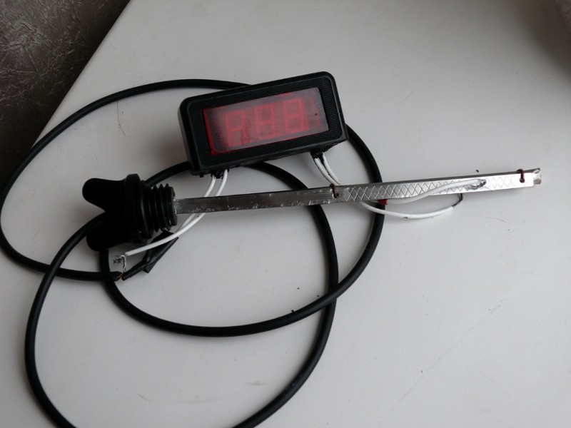 включенный прибор Коротко, что и как: Сначала в пробке, параллельно щупу, было просверлено сквозное отверстие, под диаметр провода, затем, примерно на 2/3 толщины пробки, рассверлено диаметром под трубку антенки, вставлено и посажено на герметик. Сам датчик, с термопастой находится примерно между серединой и нижней меткой щупа. Нижний конец трубки замазал сначала герметиком, затем запаял. На всякий пожарный, притянул трубку к щупу проволочками. Корпус термометра сделал из верхней части сломанного мультиметра, красный экранчик - из школьной линейки. Его пришлось вклеить снаружи, иначе по толщине прибор в корпус не входил. На фото, циферки бледновато получились, на самом деле гораздо ярче светят.