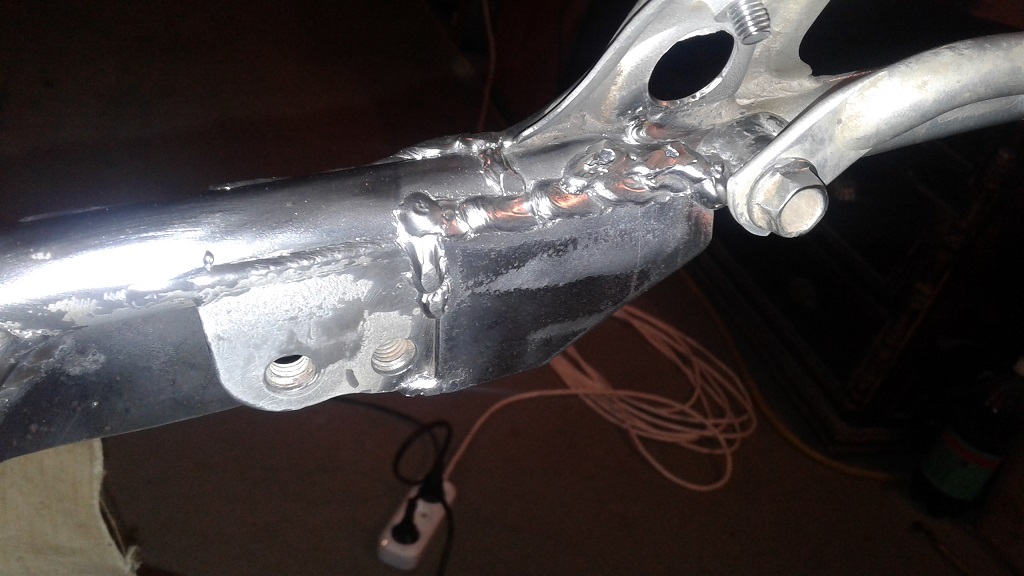 | Тяжёлый глушитель, сильные вибрации вот и пошла трещина.Надо было изначально сделать усилители подрамника. Я делал из 5 мм. полоски стали усилители и выглядели как одно целое с рамой мотоцикла.