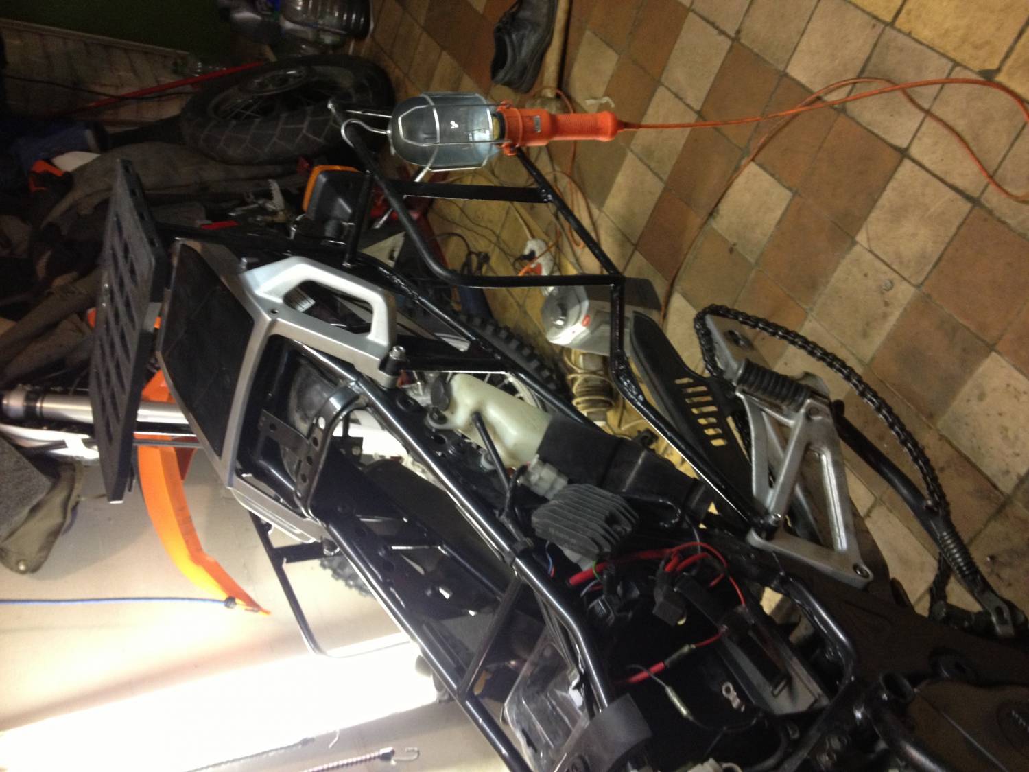 kris1956, Штатный багажник изнутри залил эпоксидной смолой и просверлил в нем 4 отверстия. К нему через демпфера (сантехнические резинки) прикрутил самодельный трубчатый багажник, от него пустил прямые трубы (на сколько возможно) к подножкам. Езжу с 48 литровым кофром по разбитым дорогам, проблем нет. Сейчас жду боковые алюминиевые кофры и буду варить рамки. Еще хочу закрепиться к нижнему креплению штатного багажника и усилить раму.