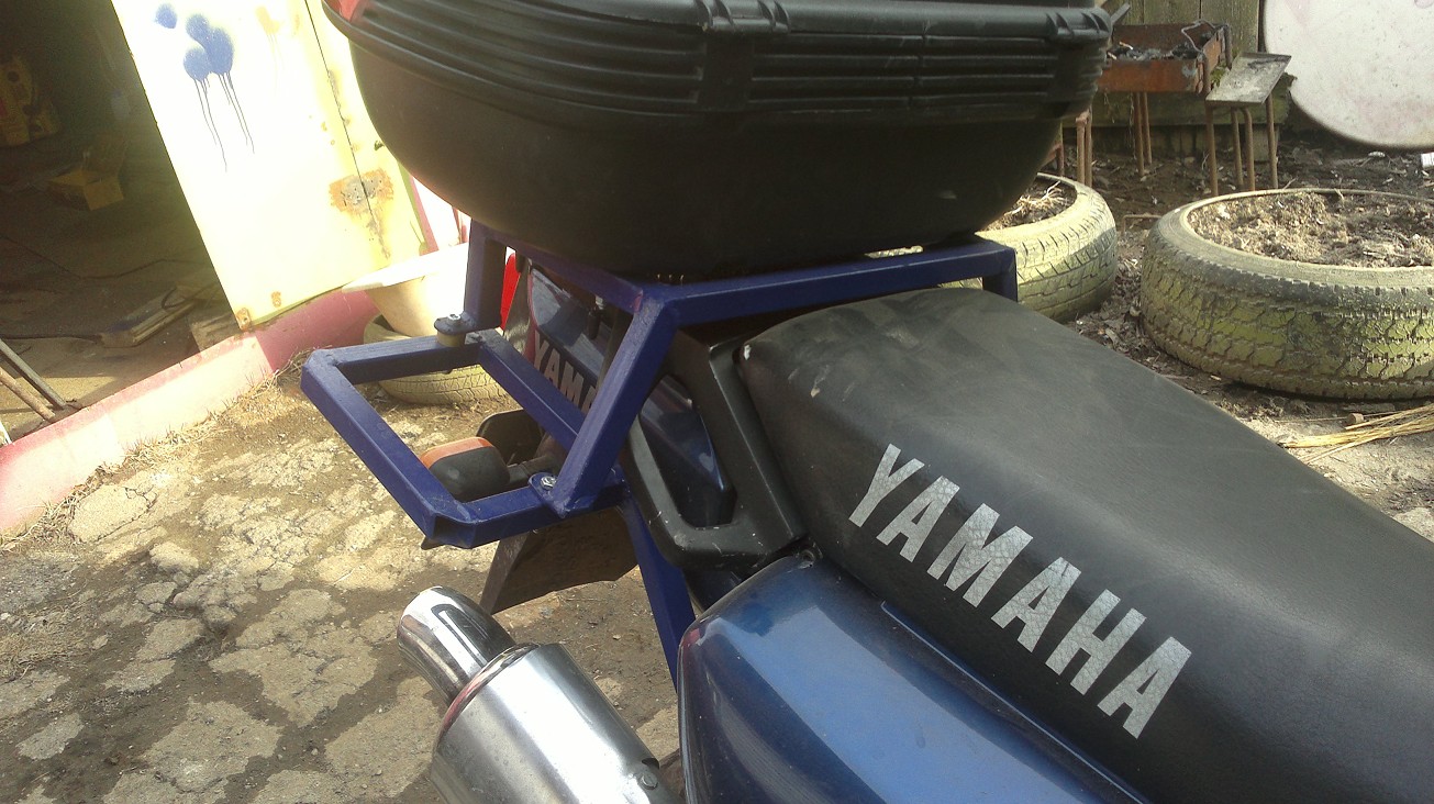 для eli и всех коллег фото багажника. профиль использован 20\20мм. По бокам от кофра можно увязать палатку и спальник.В принципе-ни кто не мешает сделать боковые рамки(они прекрасно закрепятся.только под крылом сделать распорку. я остановился на данном этапе,так как не имею груза для перевозки более данного багажника. тубус купил на рынке -это какая-то фляжка аллюминевая.пробка на резин.уплотнении. крепление багажника вы увидели- на подножках задних слева-от болта ручки пассажира,справа-от кронштейна глушителя. испытал падением. сам поломался,а багажник спас всю красоту мопеда))
