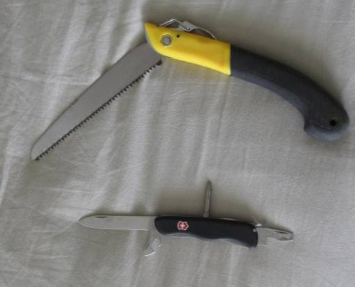 | Мой выбор это Викторинокс на поясе всегда и при необходимости можно взять с соьой такую вот складную пилу (длина клинка 17 см) - весит раз в 10 меньше топорика и компактна весьма, а веток можно напилить быстрее, чем нарубить. Правда топорик универсальнее