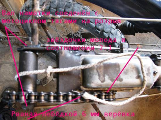 В том году делали иную конструкцию лебёдки. На ведущую звёздочку приварили кусок трубы диаметром 30мм (вал намотки), а другой конец упёрли на подшипник жестко крепящийся через крепления к раме. Но когда мотоцикл увяз в болоте почти по бак, лезть в грязь устанавливать лебёдку стало впадло, и вытаскивали руками. По этому первый вариант предпочтительней.