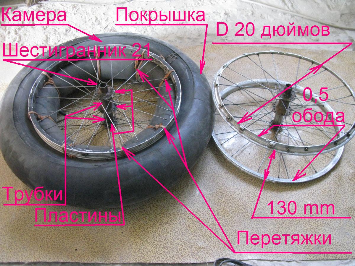Четвёртое. Пневмо колёса. В интернете есть много самоделок полноприводных мотоциклов на пневмоколёсах. Такой мотоцикл самый вездеходный, но совсем не пригодный для асфальта. Моя же задача сделать супер универсальный, трансформер - добавить пневмоколёса не меняя конструкцию обычного мотоцикла. Тут бы гаишника видом мотоцикла ночью не напугать. Он на асфальте обычный мотоцикл, а на болоте – болтоход. Основная проблема здесь сделать колёса. ( Все промышленные пневмоколёса очень тяжёлые для мотоцикла). Перепробовав колёса с алюминиевой трубки, водостойкой фанеры, пришёл к итогу, что самый лучший результат получается с велосипедных алюминиевых колёс на 20 дюймов, (велосипеды Десна, Аист, и иные «китайские» велосипеды среднего размера), они подходят под жигулёвскую камеру на 13 дюймов. Технология изготовления пневмоколеса такая. Ступица делается с трубки диаметром 30мм длиной 65мм, и толщиной стенки 2мм и такой же приваренной к ней трубки только толщиной стенки в 1мм.