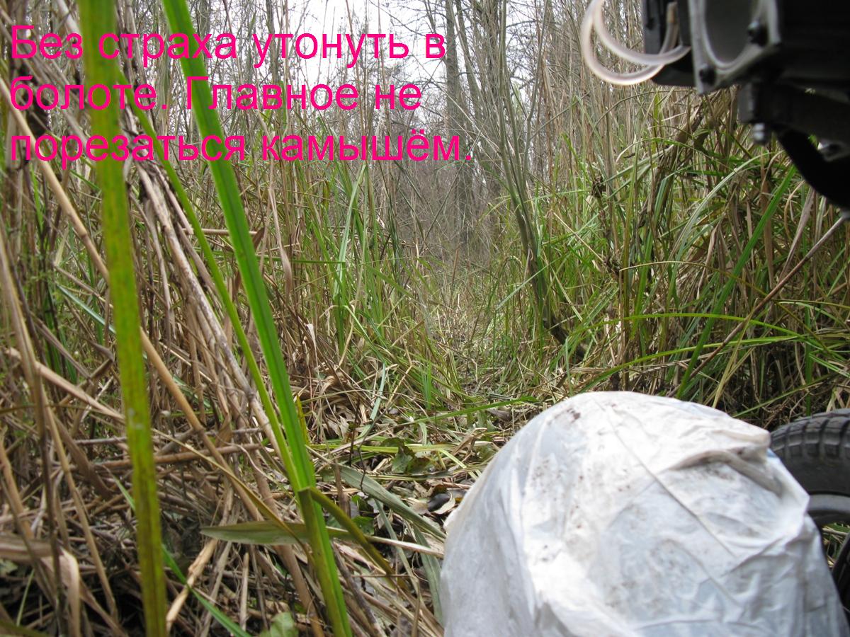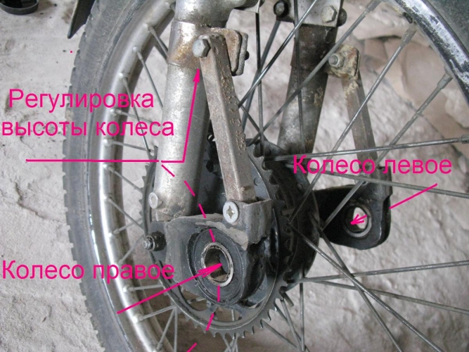 Спереди всё проще. Обоймы с подшипниками прикручиваются вместе с передним колесом шпилькой к перьям. А высота подъема обоймы относительно оси колеса, регулируется тягой и хомутом, скользящим по стакану пера. Переднее колесо просто вставляется в подшипник в обойме и затягивается болтом. Вся конструкция собирается за 10 минут. Ваш мотоцикл, любой модели превращается в пневмоход. А если к колёсам привязать с боков по камере, то ваш мотоцикл будет и плавать с вами, только привяжите палку с поплавками к мотоциклу, что бы ни опрокинуться в бок. Вся система, состоящая с четырёх колес, маятника, крепления передних колёс весит 16 кг.