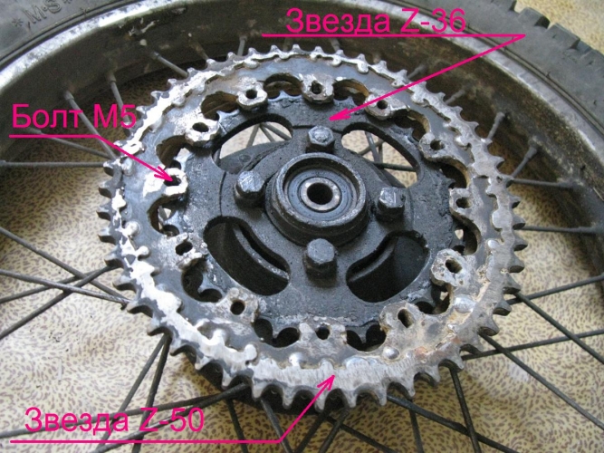 Ну а если такого мотора как надо нет, а надо, начинаем подбирать передаточное соотношение трансмиссии звёздочками. Я уже где-то, когда-то писал о способе крепления большей звезды к маленькой, а не замене её. Это сильно уменьшает вес запчастей перевозимых вами, и сохраняет время на замену звезды. Конечно, если вы ленивы, то мучайте себя и мотор. Ум приходит не сам.