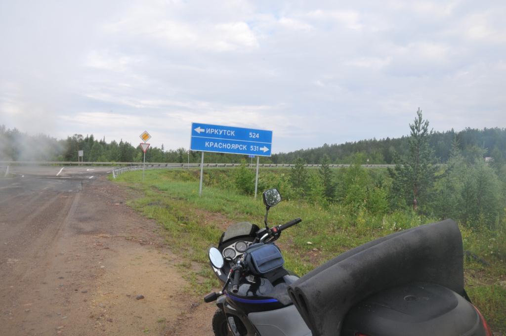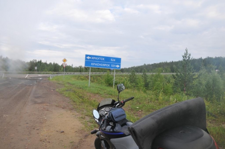 Начал путешествие на Аляске, через обе Америки, Турцию и какие-то еще страны он въехал через Владикавказ в Россию. Самым необычным для него оказались просторы наше необъятной Родины. По его словам обе Америки он преодолел гораздо быстрее, чем "вашу Рашу". Мол едешь-едешь, оглянулся - Раша, едешь снова, долго едешь, глядишь - всё та же Раша, даже из региона не выехал. Иностранцев всегда это впечатляет )) Немного поговорили на тему мотоциклов, быта мотопутешественников, выяснили, что конечный пункт для него - Токио. Отчаянный, смелый, крутой чувак! Уважаю и крепко жму руку! Едем дальше. После, казалось бы, доброго знака - встречи мотопутешественника мирового уровня - всё стало портиться на глазах. Небо заволокло серыми тучами, начал моросить мелкий дождик, через пару часов он превратился в холодный ливень, визоры заливало, стало темно и жутко холодно! Увидев поворот на деревню Мара, были очень рады. Свернули.... 10 домов, местная жительница с улыбкой повествовала, что ближайший магазин в 7км от них (в Нижнеудинске). Ночевку организовали в заброшенном доме, предназначенном под снос. Влезть в него мы смогли только через оконный прем, ибо все ворота-двери покосились и открыванию не подлежат. В куче мусора нашли дверки от старого шкафа, закрыли ими дыры в полу, старой тряпкой из той же кучи мусора помыли пол, как смогли. Между первым и вторым этажом того дома огромная дыра, из которой всё время текла вода - дождь не переставая, хлестал всю ночь (( Сложили из кирпичей что-то вроде очага, развели костер. Собрали в котелок дождевой воды, заварили на газовой горелке в котелке чай, разделили Сникерс на двоих и стали просушивать одежду. Веревки растянули, вещи развесили. От костра дом стал немного уютным, если можно так сказать про развалюху, заросшую крапивой и облюбованную местными алкашами для проведения сборищ. В этот момент я подумала о том, что не хочу более путешествовать )) На удивление, ночь прошла спокойно. Рано утром пришлось долго пялить на себя мокрую одежду - всё, что было - термобельё, джинсы, кожаные штаны, майка, водолазка тонкая, водолазка шерстяная, флисовая куртка, кожаная куртка, "намордник"-подкасник, шапка, перчатки, 2 пары носков, ботинки. Во всем этом снаряжении двигаться вовсе неудобно. Благо двигаться мне пришлось. Водрузившись на мотак привычным вторым номером, стала дремать в пути.