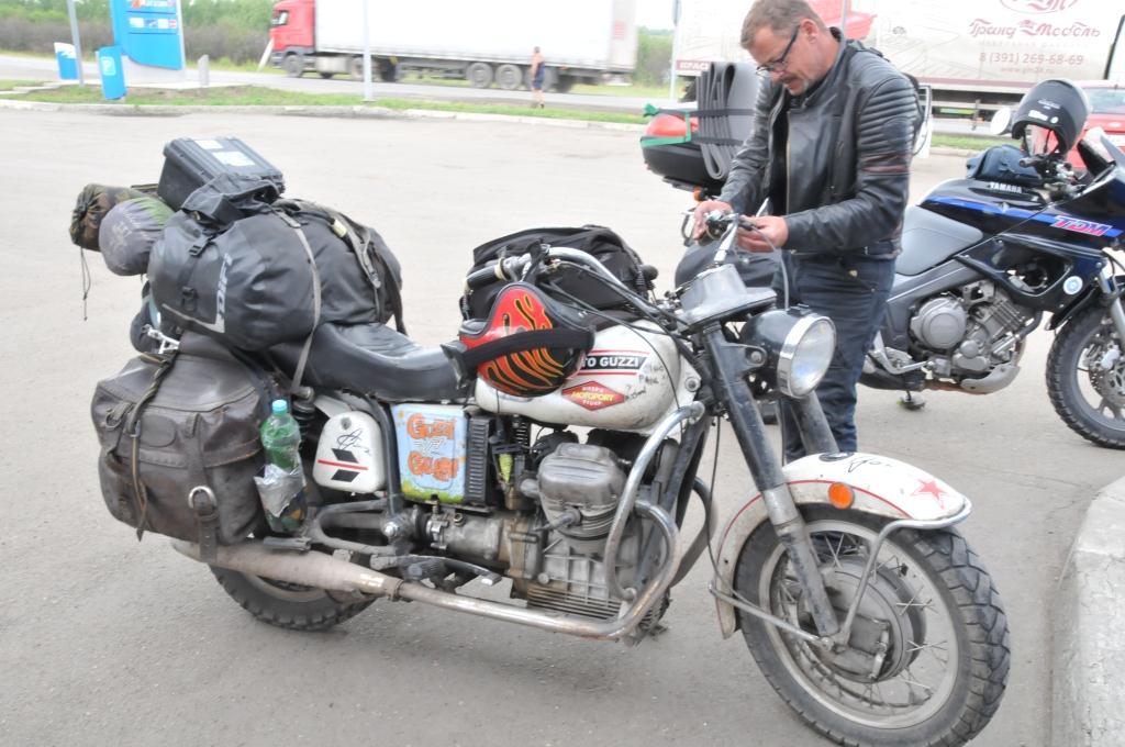 Начну с того, что я сама не мотоциклист. Пока. Мотоциклами "болен" мой дражайший супруг. Когда мы поженились у него был Кава для поездок в лес по грибы-ягоды-орехи. Через год он стал активно произносить слова "новый мотоцикл", "путешествие", "хочу". Поскольку опыта катания у меня было совсем не много, я легко согласилась. Мне казалось, что это будет волшебно! Еду я, значит, а волосы назад (почему-то в мечтах я без шлема), джинсы на мне модные с рваными коленками и легкая белая майка-разлетайка на загорелом теле! Ветер развивает локоны, солнышко печёт, браслеты позвякивают и счастью моему нет предела! Ага-ага... так и былО! Сборы заняли совсем не много времени, право разработать маршрут принадлежало мужу, я собрала всё самое необходимое - 3 купальника, парео, панаму, шорты-майки, косметику для тела, для волос, для лица, от загара, для загара, после загара + аптечка. Как выяснится позже, ничего из указанного ни разу мне не пригодится. Выехали не рано, дабы не мёрзнуть от утренней прохлады, дождались солнца и в обед были таковЫ. Подъезжая к заправке, обнаружили, что и солнце не такое уж активное, как предполагалось, несмотря на июль. Переодевшись, утеплившись, покинули город Ж. Первые 300 км всё казалось интересным, захватывающим. Знакомые места, родные поля, луга, лес. В Канске останавливаемся на первую заправку. Пока мой мотоциклист заправлял бак, фотографировал показания приборов и что-то еще, я познакомилась в иностранцем. Пол ван Хофф оказался Голландцем, путешествует уже 9 месяцев на МотоGuzzi, 1975 г.в.