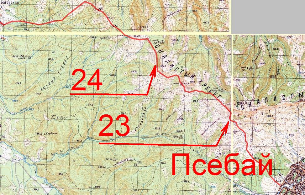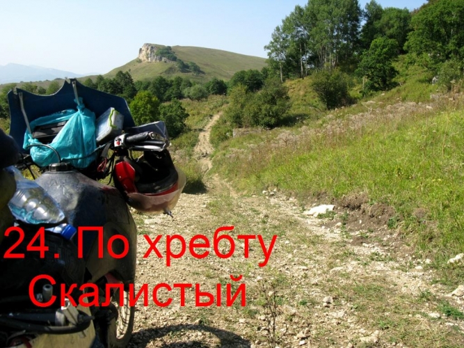 Возвращаемся в Псебай, где он показывает поворот, куда надо ехать. Говорит, что дорога идёт по хребту «Скалистый». Есть четыре вершины, которые надо объехать, главное не заблудится. Стараюсь запомнить всё, что он говорит, и начинаю движение.