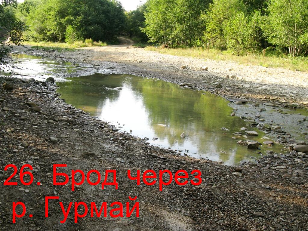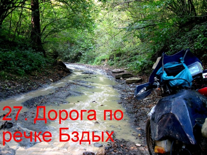 Через два километра нормальной грунтовки прямо в броде дорога расходится на две дороги. Одна идёт вдоль реки Гурмай, вторая по руслу речки Бздых. Встречаю Уазик и расспрашиваю дорогу. Водитель Уаза сообщает, что дорога вдоль Гурмая в ужасном состоянии, по ней возят лес Уралы и там колея по грудь и больше ничего, а по речке Бздых можно доехать до Даховской, но лично он не ездил. Я решаю ехать вторым вариантом по речке Бздых. Дорога по речке Бздых представляет собой глубокую канаву шириной 3-4м с каменным дном, по которой всегда течёт вода. Сейчас глубина минимальная до пол колеса, но весной бывает, что у бортового Урала вода скрывает борта кузова.