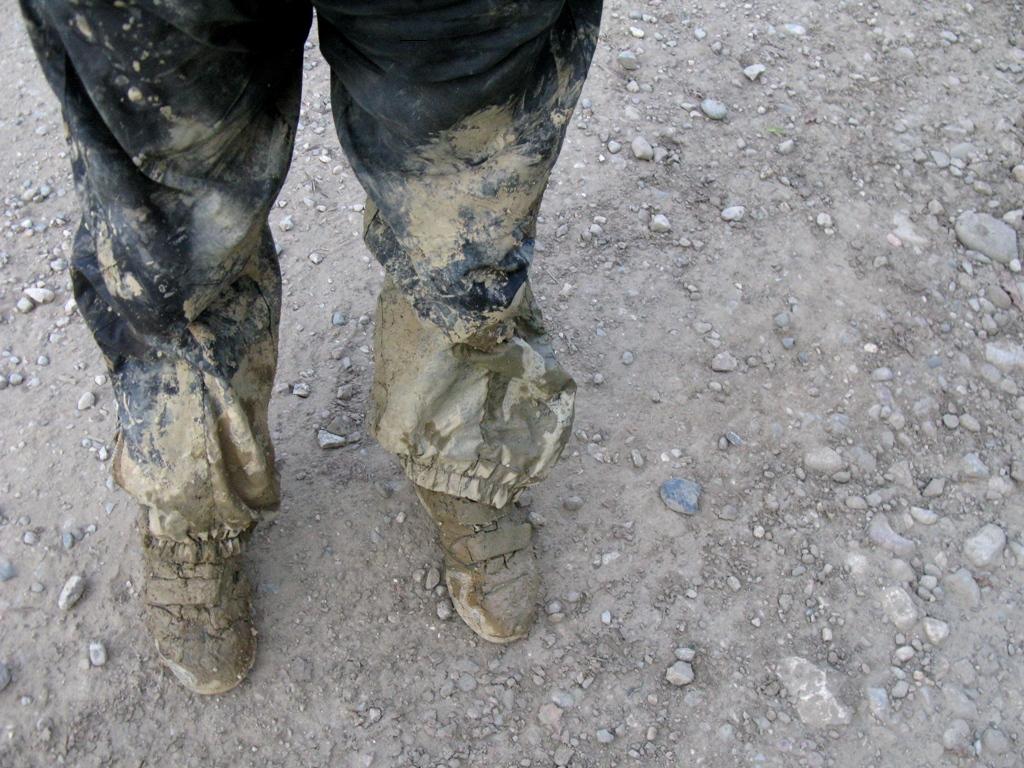 Падений от усталости и сложности дороги не счесть. Защиту рук уже не ровняю, сейчас опять упаду. От пота промок до трусов, чувствую, как чавкает в кроссовках. Уклон вниз до 15%. Это спасает на гатевых участках, где иногда не хватает бревна, и колесо просто застревает в дороге. Тут дорога стает идеальной на 2 км. Я было обрадовался, что муки закончены, но не тут-то было опять та же картина – справа и с лева навалы от бульдозера, а посерединке колея со сметаной от жёлтого, до чёрного цвета. К ночи добираюсь до села Усть-Сахрай. Я промокший и ужасно грязный.