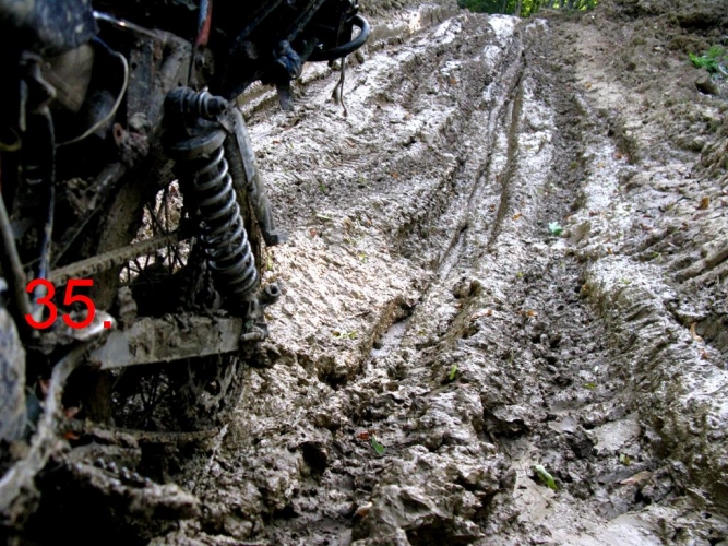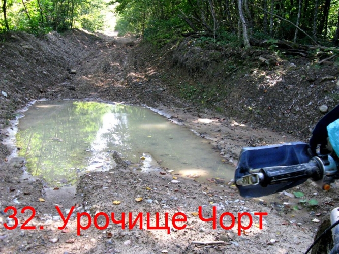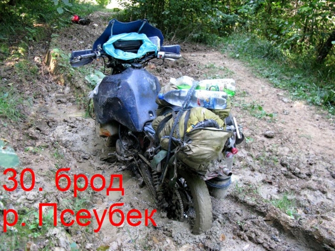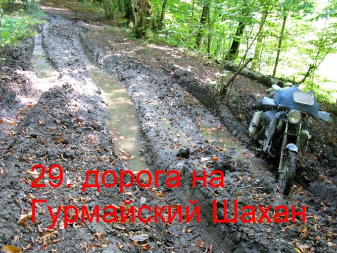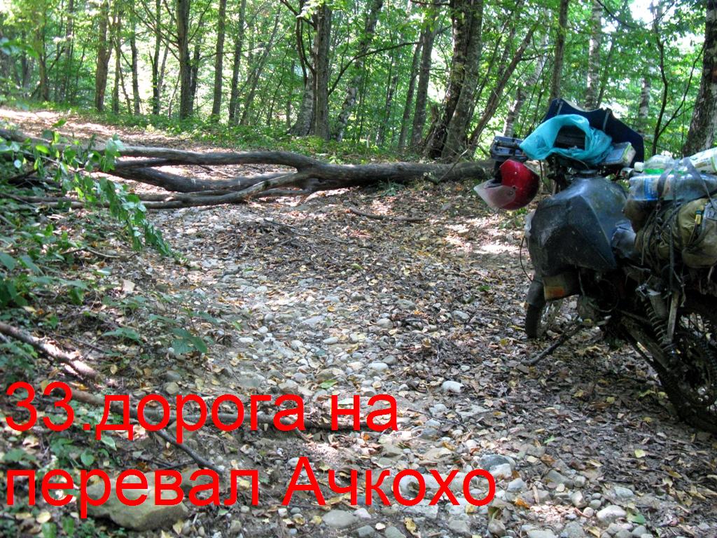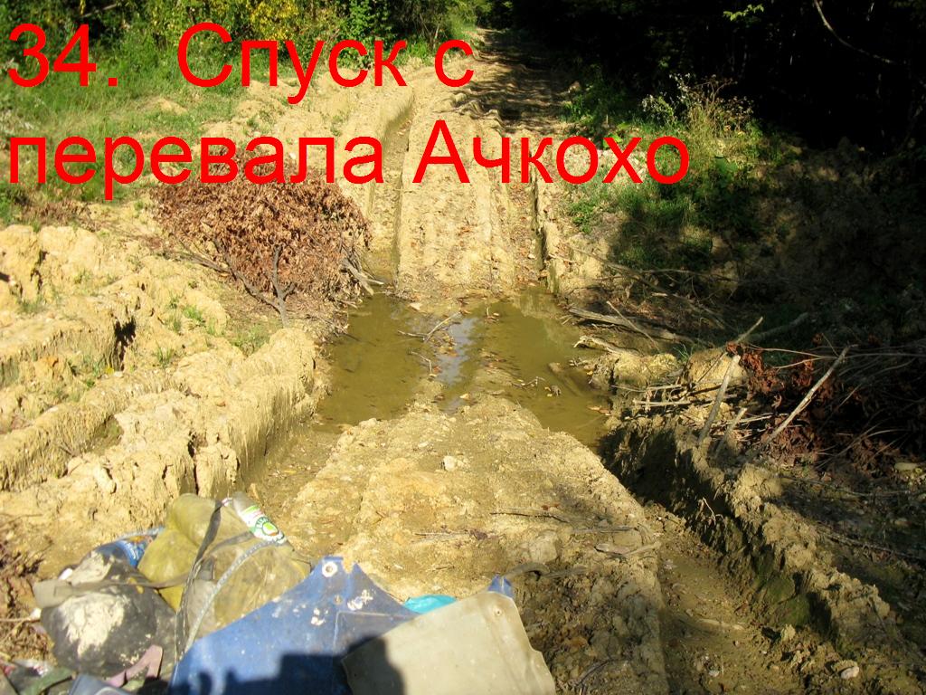 Через 7 км от поворота на эту дорогу, выезжаю без труда на перевал. Вершину Ачкохо не видно, всё в лесу. На перевале начинаются лужи, и чем дорога ниже спускается, тем их больше. Дорога идёт по урочищу Ельники. Теперь каждый километр потом и кровью. По луже ехать не возможно лужи с пол метром воды и метром мокрой глины на дне вглубь, залезь в которую, сам мопед не вытащу, а объехать иногда просто негде, деревья растут прямо с луж. Попадаются лужи глубиной до 2 метров. Понимаю, что колёсная техника здесь не ходит.