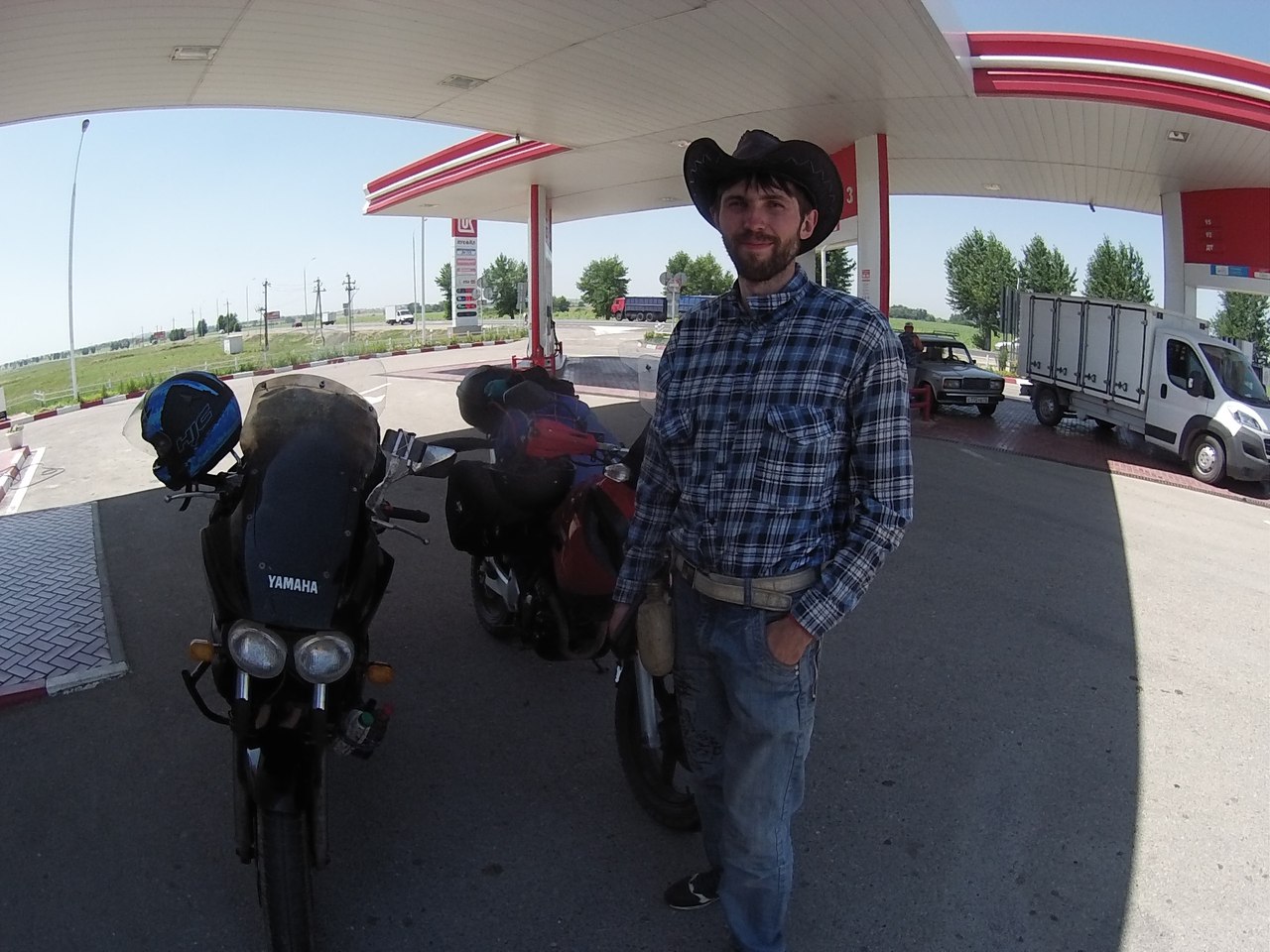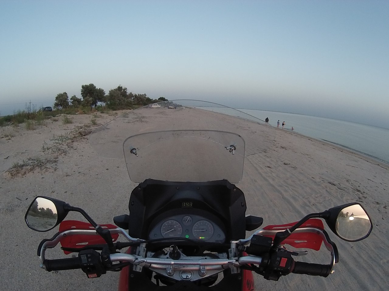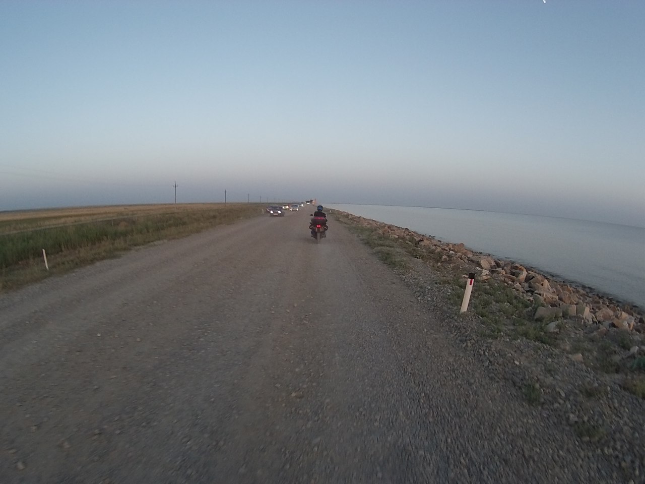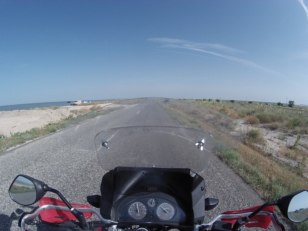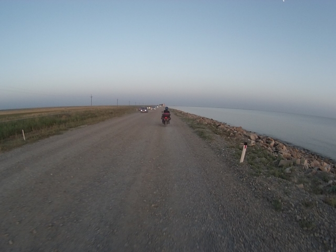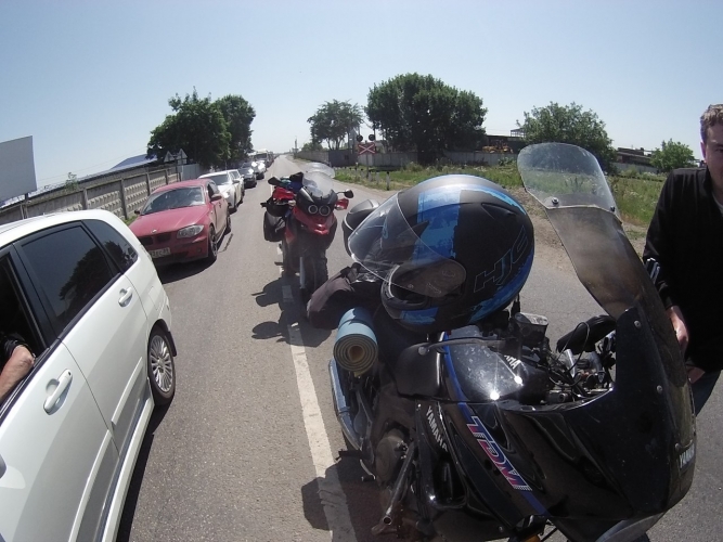 Встаем в самом начале очереди, лихо объехав более чем километровую пробку. Минут 10 стоим, пропуская поезда, а потом снова мчим дальше, переодически останавливаясь что бы одеть рубашку с рукавами (так как сгоревшая кожа ужасно болит) или снять её (тк невероятно жарко).