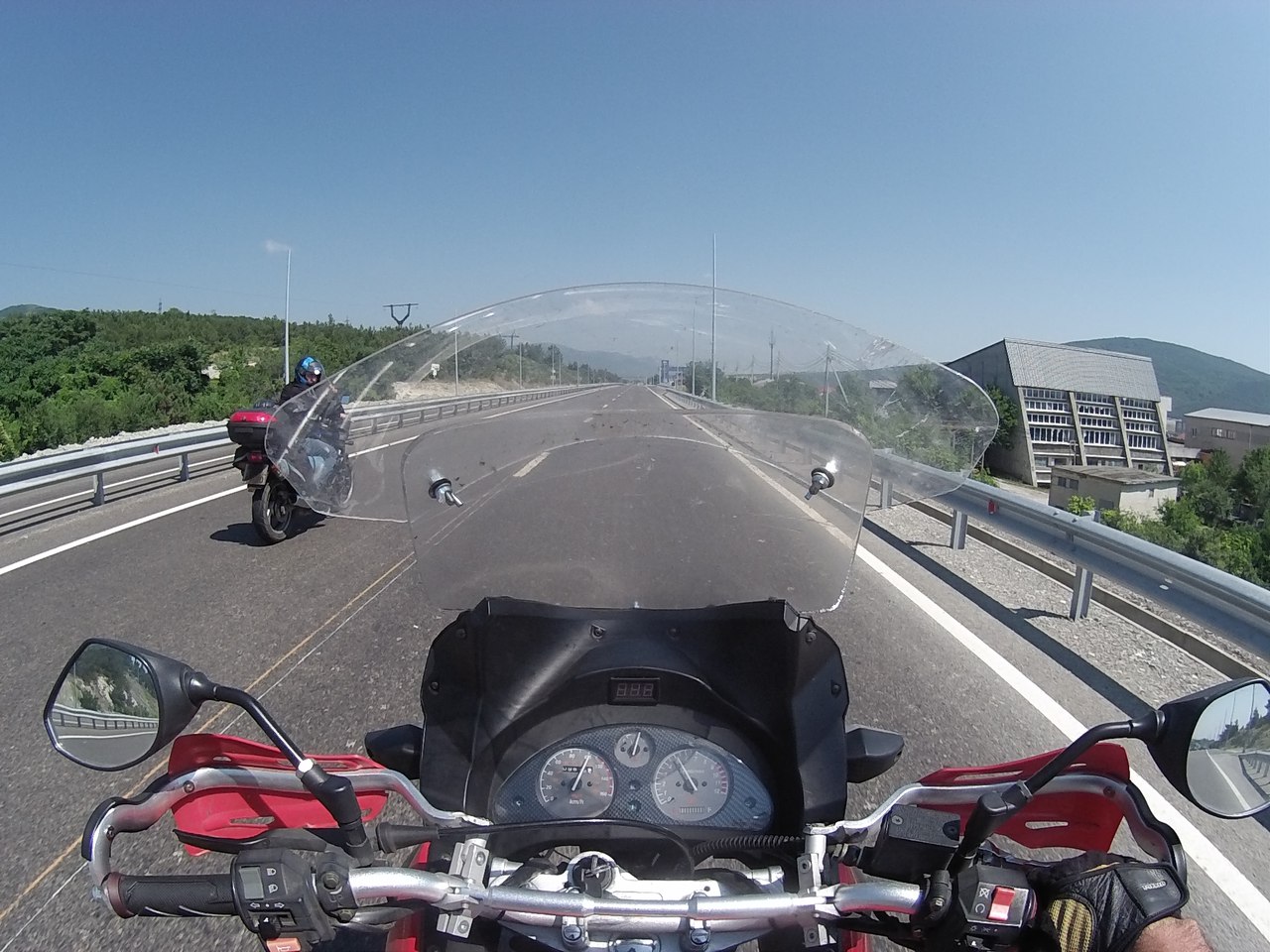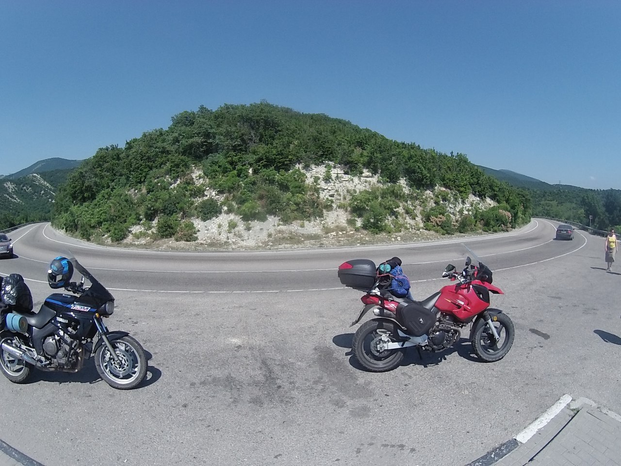 И снова горные серпантины и захватывающие пейзажи. Машины едут потом по несколько штук, упершись в какого- нибудь тошнота. Обогнать довольно непросто и в большинстве случаев обгон запрещен. Но бывает, что обогнав такой мини караван оказываешься на пустой дороге. Вот тут то есть где разгуляться! Лихо закладывая байк в повороты. Пару раз увлекшись чиркнул подножками асфальт. Пару раз с трудом входил в радиус поворота... Вообщем дорога просто провоцировала, на активную езду.