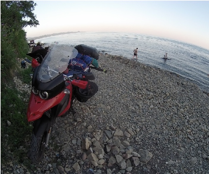 Катим потихонечку в Джубгу. Там закупаемся провиантом и едем далее в сторону Сочи, в надежде найти автокемпинг. Автокемпинг нашли. Стоит он- 500 рублей с мотоцикла (авто-1000 руб). Пляж- каменистый. Спуск к нему есть даже для машин. Бесплатно- душ и вода питьевая. На территории есть кафе и магазин. В аренду можно взять катамаран.