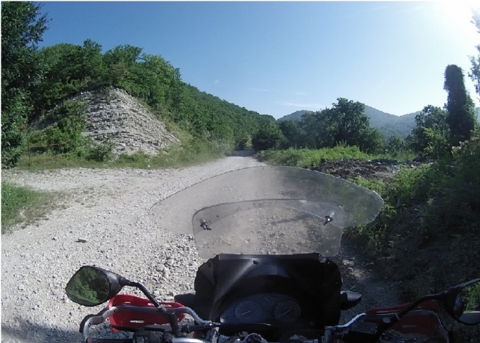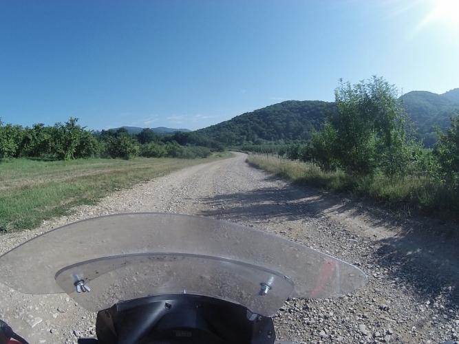 В какой то деревеньке я увидел табличку- "Водопады налево" и повернул к ним. Ехал по этой деревне и потихонечку выбрался на каменистую дорогу, петляющую между гор и цветущих садов с яблонями, черешней, орехом и еще бог знает с чем. Дорога- просто адовая. Состоит из камней разного размера и пыли.