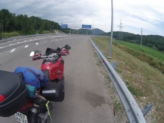 Спускаюсь к побережью и тут небо затягивает облаками. Начинается теплый южный дождь. Ехать в дождь здесь настоящее удовольствие. Странное дело. Прохладный воздух и теплый дождь... Что плохо- обгоревшая кожа очень больно рягировала на каждое косание, а уж на удар капель отзывалась резкой колющей болью. Остановился на АЗС и переждав дождь (4 минуты, я засек), двинулся далее.