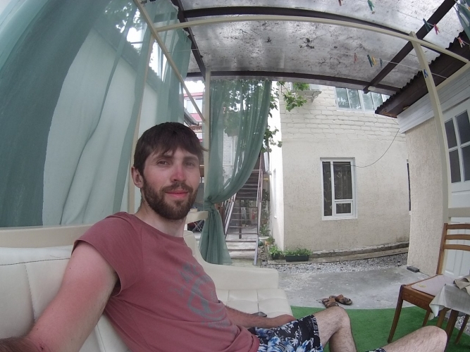 Скидываю с байка вещи, паркую Каркалыгу, укрывая её тентом, переодеваюсь и спешу скорее на море. По пути примечаю уютную столовую и захожу проведать ценники. В итоге- овощной салат, солянка, плов и местное домашнее вино мне обходятся в 350 рублей (из которых 100 рублей за вино).