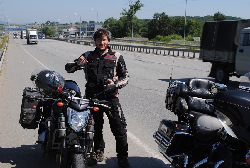 Совпало так что у Словака пробег на въезде во Владик был ровно 100.000 км,и я его запечатлил со Словацкой водкой,он надпил и в бак налил немного :-) Байк покупал новым в салоне Yamaha FZ1.