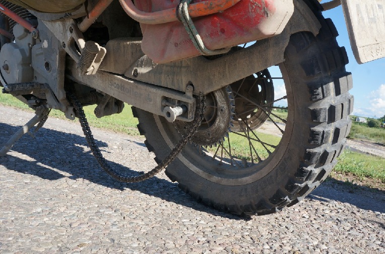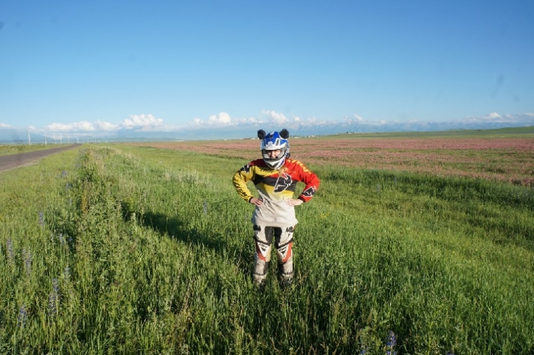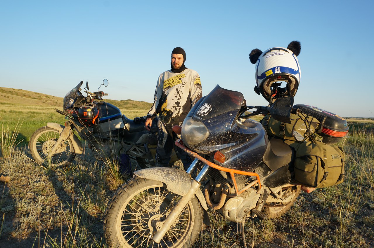 Оказалось, что найти цепь в Алма- Ате не такая простая задача. С утра парни обзвонили пару мест и нашли китайский Дид за 3000р на одном из базаров. Миржан взялся нас проводить. Скучковались в колонну из трех мотоциклов и поехали. На базаре, одном из контейнеров был мото- магазин, где за 3к рублей мы купили «настоящий» китайский DID O-ring по нему сразу было видно, что цепь дерьмо, но на старой уже ехать было нельзя. Менять разместились прямо там. Благо, был выходной и многие контейнеры были закрыты. Вместе с цепью, комплектом поменял и звезды, как положено. Времени у меня это заняло многовато и пока я три часа ковырялся, к нам регулярно подходили местные жители позитивно пообщаться. Наконец, закончили и поехали на север. Пока дороги отличные. Жара по прежнему ужасная, но пока мчишь по трассе самочувствие прекрасное. На ночлег встаем в палатке не далеко от трассы у реки. Забрались подальше. Место довольно живописное. Следующий день ходовой. Тут дороги уже портятся. Асфальт начинает изобиловать ямами и волнами. Нагрузка на технику велика, поскольку все пролетаем на скорости. Наташа регулярно оттормаживается. Фривинд- это вам не Джебел… Думали на ночлег встать около озера Алаколь, но когда трасса до него дошла, берега оказались заболочены и зловонны, поэтому решили ехать дальше. По дороге купили рыбу, благо, она тут продается везде. Что за рыба, не помню. Помню, что было вкусно. Новый день. Снова жара, снова качество дорог ниже среднего. К обеду доезжаем до Усть- Каменрогорска. Пытаемся найти кафе- безуспешно. Дальше, я планировал ехать к о. Зайсан, на север озера. Объявляю Наташе, что до парома, если он существует, осталось 100 км. если его нет- еще 600 км. Она мне объявляет, что вообще не хочет туда ехать. Меня это взбесило, в результате поехали мы в сторону Рубцовска.
