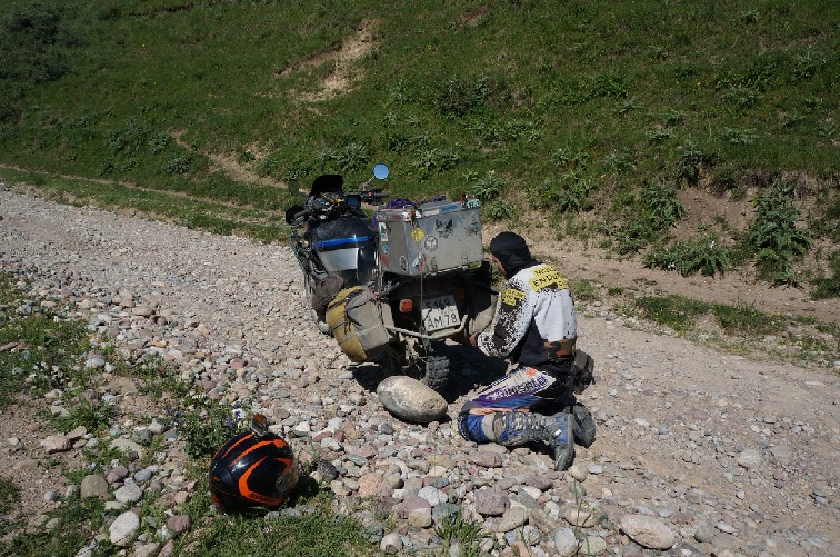 Пришло время двигаться в обратном направлении. Едем снова через Каракол. По дороге нас ловят Киргизские гаишники за превышение. Просят 500р взятку- даем, нет смысла препираться. Опять же, чтоб два раза не ехать одной и той же дорогой двигаем на перевал, тот самый, который год назад не понравился Наташе. Грейдер кончается и каменистая дорога уходит в гору. здесь посередине подъема я снова получаю камень между звездой и цепью и все выглядит сильно хуже чем в прошлый раз. одно из звеньев идет винтом довольно сильно. Ставлю на место и через метров 20 подъема звезда слетает уже без камня. Натягиваю цепь сильней. Она хрустит и дергает. Думаю, что ушел подшипник звезды, поэтому после того, как в очередной раз цепь слетает, разбираю колесо, но там все оказывается весьма неплохо. На всякий случай, подшипники все- таки меняю и это помогает. Но на границу мы уже не успеваем. Ночью меня почему- то лихорадит, но к утру я полностью здоров и полон сил.