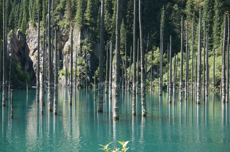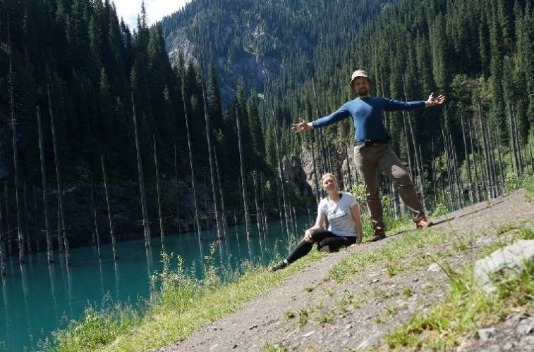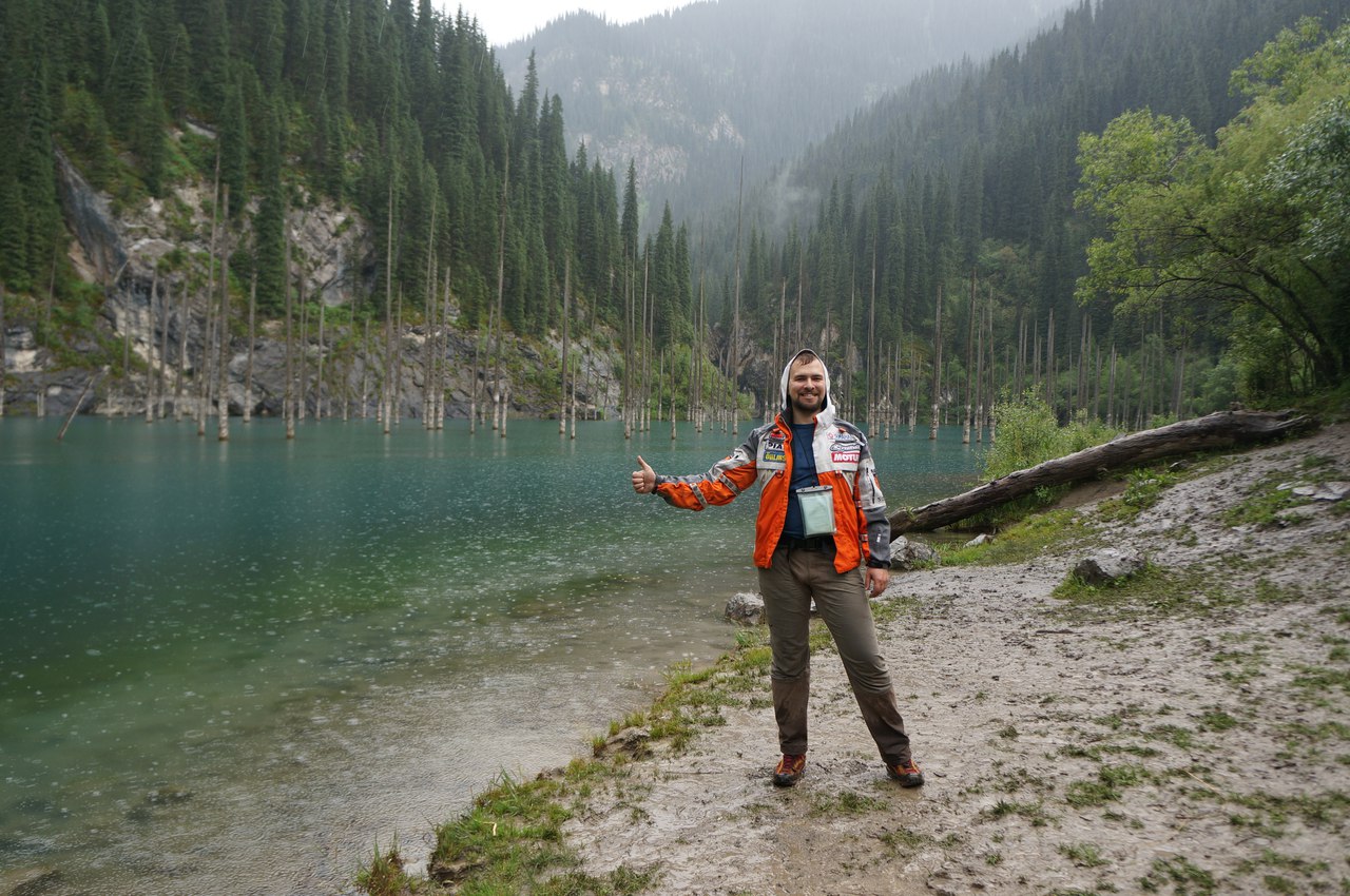 Дальше наш путь лежал на озеро Каинды. Мы по дороге заправились, закупились едой. Доехали до населенного пункта Саты и свернули к озеру. Дорога грунтовая. Через пару километров пересекается одноименной речкой. Брод был не глубокий и показался совершенно не напряжным. В пути всего- то второй день. Совершенно не устали, полны сил и оптимизма. Силы нам по дороге понадобились. Сразу после шлагбаума, где с нас содрали какие- то деньги за въезд в нац. парк, (Похоже по будням проезд был бы бесплатным, но мы приехали в воскресенье.) Дорога представляла из себя грязевое месиво. Всего метров 500, но проходили мы их очень долго. Навалялись в грязи вдоволь… В результате, таки подъехали к озеру. Здесь продолжал поливать дождь. Нам показали где можно поставить палатку- место шикарное. Подготовлены площадки под костер и заготовлены дрова. Не зря с нас содрали деньги. Успели съесть шашлык до закрытия импровизированного кафе. Перед спуском к озеру нам очень навязчиво предлагали подняться обратно от озера на лошади. Хотели они за это всего 200р, поэтому почему нет… Озеро действительно впечатляет. Зеленоватого цвета и посередине него торчат стволы деревьев. Дождь не прекращался и мы, сделав пару фоток, начали обратный подъем. Казах посадил нас вдвоем на одну лошадь. Получается я сидел в седле, а Наташа за седлом, поэтому ей не очень понравилось. Она всю дорогу пыталась не соскользнуть назад. В лагере развели костер, кстати первый раз за все время наших путешествий, но посидеть у него как следует не дал продолжавшийся дождь.