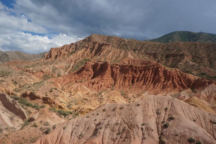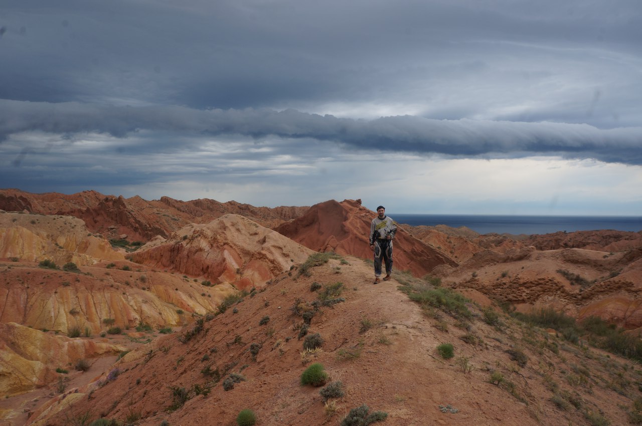 Граница Казахстан- Киргизия здесь работает до 6и вечера, поэтому заливаем на ближайшей заправке полные баки и встаем на ночлег в полях до въезда в погранзону. Утром легко проскакиваем границу. В прошлом году мы ехали короткой дорогой до Исыккуля, через перевал. Наташа на меня ругалась за это, поэтому в этот раз едем обычным грейдером и асфальтом, накрутив небольшой крюк. в Караколе поменяли деньги и едем вдоль озера к каньону Сказка. Каньон прекрасен. Дожди выточили в песчаной породе причудливой формы конструкции разных цветов. Доминирует красный, но встречается и желтый и оранжевый- очень красиво. Пока ползаем по «Сказке», прилетает гроза. Моментально выгоняет всех туристов. Мы тоже собираемся под дождем.