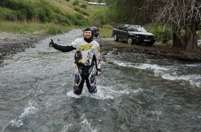 Утром искупались в озере- вода холодная. Собрались и поехали к Караколу. Здесь я хотел добраться до некого озера, но дорога стала ухудшаться и Наташа дальше ехать отказалась. Ок. Парни оставили координаты горячего источника здесь неподалеку- пробуем двигаться к нему. Но и здесь дорога изобилует крупными камнями и небольшими бродами. Для меня это все не проблема, от слова совсем, но я, к сожалению, не могу ехать сразу на двух мотоциклах, поэтому, углубляемся километра на два в сторону источников и разворачиваемся обратно. На ночлег встаем не далеко от того места, где ночевали днем ранее.