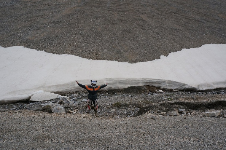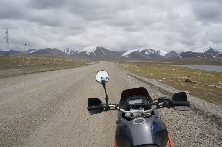 На ночлег решаем встать на турбазе. Шикарное место. Довольно дорого для нас, но за 50 баксов получаем шикарный дом с интернетом и горячим душем. Еще в Алма-Ате, Нагим поделился с нами треком их поездки на Памир через Киргизию. Теперь настал момент залезть поглубже в горы. Идем точно по треку. Я думал, что мы поедем на перевал Тосор, но оказалось, что мы шли совсем в другую сторону. Что ж, «нас невозможно сбить с пути. Нам пофигу куда идти!». Горы здесь просто великолепны. Дорога качества отличного. Она ведет на золотой рудник, поэтому там все время снуют грузовики и вахтовки. Когда высота дошла до трех тысяч метров Сутенер снова начал капризничать. Опять пропадает вся тяга на низах. Но если на Ак- Байтале можно как следует разогнаться и не сбавлять обороты, то здесь серпантины весьма резкие и на поворотах, хочешь- не хочешь, оттормаживаться надо. В конце концов я приноровился крутить мотор, подыгрывать сцеплением и разгонять мотоцикл. Плюс около поворотов имеются большие ровные площадки. Подозреваю, что не только у меня такие проблемы в выскокгорье. Но потом и Фривинд начал нас удивлять. Все у той же отметки в 3000, перестала переключаться коробка с первой на вторуюпередачу. В результате, у нас получился забавный тандем: я не могу ехать медленно, иначе не получится тронуться, а Наташка не может ехать быстро, поскольку не переключить на вторую… Мне приходится уезжать вперед, и ждать, как только подъем заканчивается и начинается спуск. Идем дальше по треку. Дорога на рудник уходит влево, а нам- прямо. Выкручивая мотор по довольно неплохой, все еще, дороге, влетаю на перевал 4000м. Здесь уже лежит снег и довольно прохладно. Жду Наташу. Фоткаемся, обедаем и двигаем дальше.