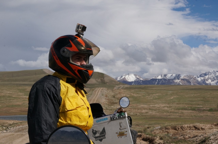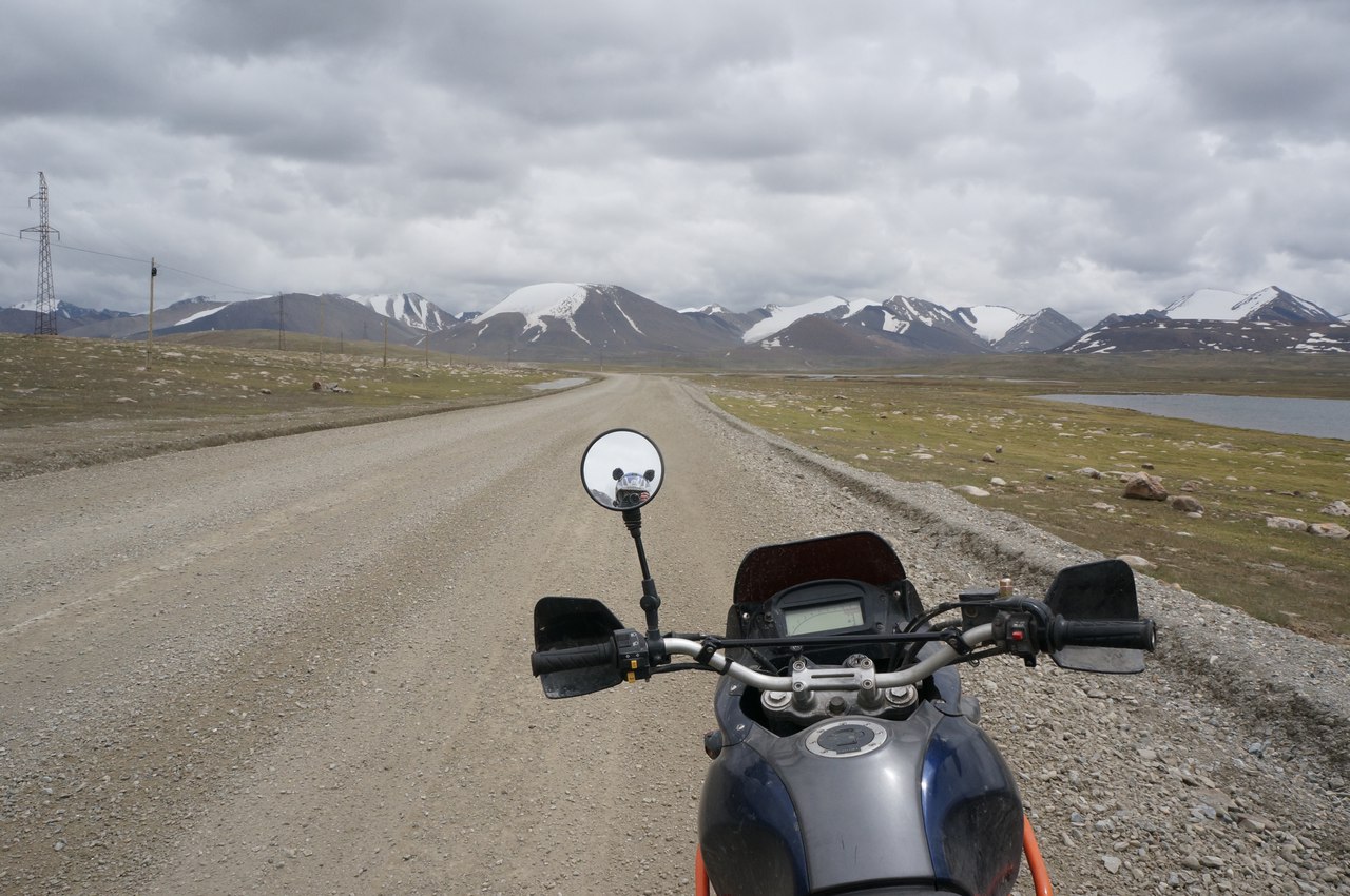 Уже понемногу откуда- то сбоку начинают ползти грозовые тучи, что нас не может радовать на такой высоте, поэтому особо не мешкаем. Дальше дорога спускается в долину. высота 2500. У Фривинда, все еще довольно плохо, но уже включается вторая… Преодолеваем небольшой брод и начинаем убегать от грозы. Вроде все успешно, гроза проходит мимо. Перед нами красивейшие горы с белыми вершинами. Везде бегают суслики, которые здесь размером больше средне статистического кота. Дорога сворачивает влево и через километр, в Кара- Сае, упирается в ворота с колючей проволокой, где нам заявляют, что это погранзона и дальше нас без пропуска не пустят. Приходится разворачиваться в обратную сторону, чего я без посторонней помощи сделать уже не могу- ворота на склоне, а Сутенер в горку тронуться не может, высота больше 3х. Погранцы подтолкнули и мы полетели обратно. На удачу, грозовые тучи прошли стороной. Уже на дороге с грузовиками въехали в облако и очень сильно замерзли. У меня первый раз такое, чтоб в мотоботах так замерзали ноги, они еще в броде намокли и продрогли так, что я уже не чувствовал пальцев. Ниже облаков и Коробка Фривинда и тяга Сутенера пришли в норму. Стало заметно теплей.